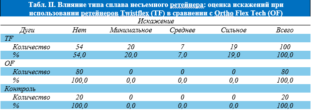 Были выявлены статистически значимые отличия между оценками искажения, присвоенными ретейнерам Twistflex и Ortho Flex Tech (P < 0,001). Искажения не наблюдались при использовании ретейнеров Ortho Flex Tech, аналогично контролям, при этом ретейнеры Twistflex вызывали искажение в ходе 46 % испытаний. В 20 % случаев искажение было минимальным, в 7 % — средним, а в 19 % — сильным (Табл. II).