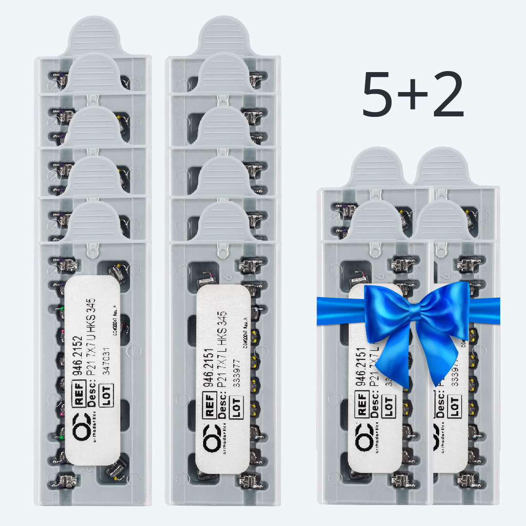 В комплекте 7 полных наборов брекетов Pitts21, 7х7 (с щечными трубками).