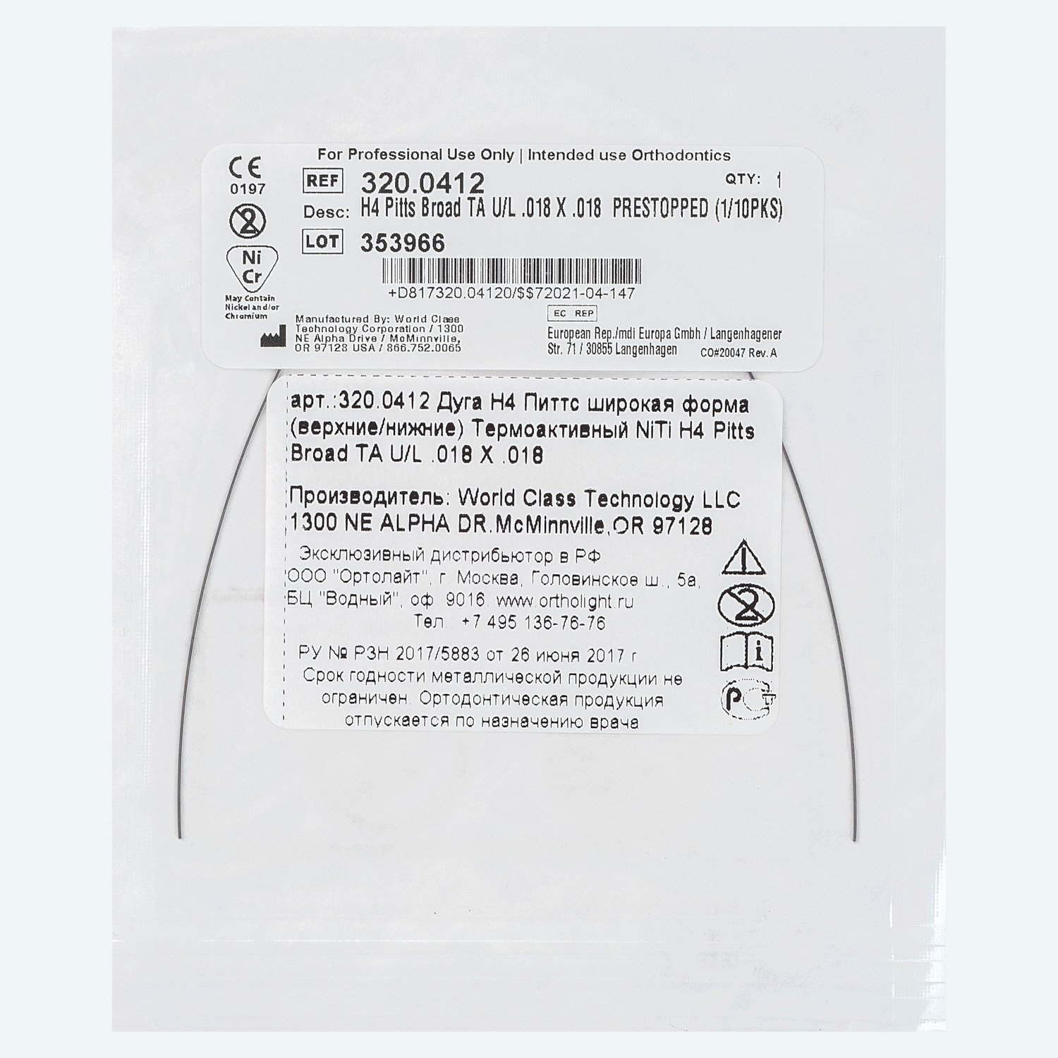 Дуги NiTi TA форма Питтса Широкая .018x.018