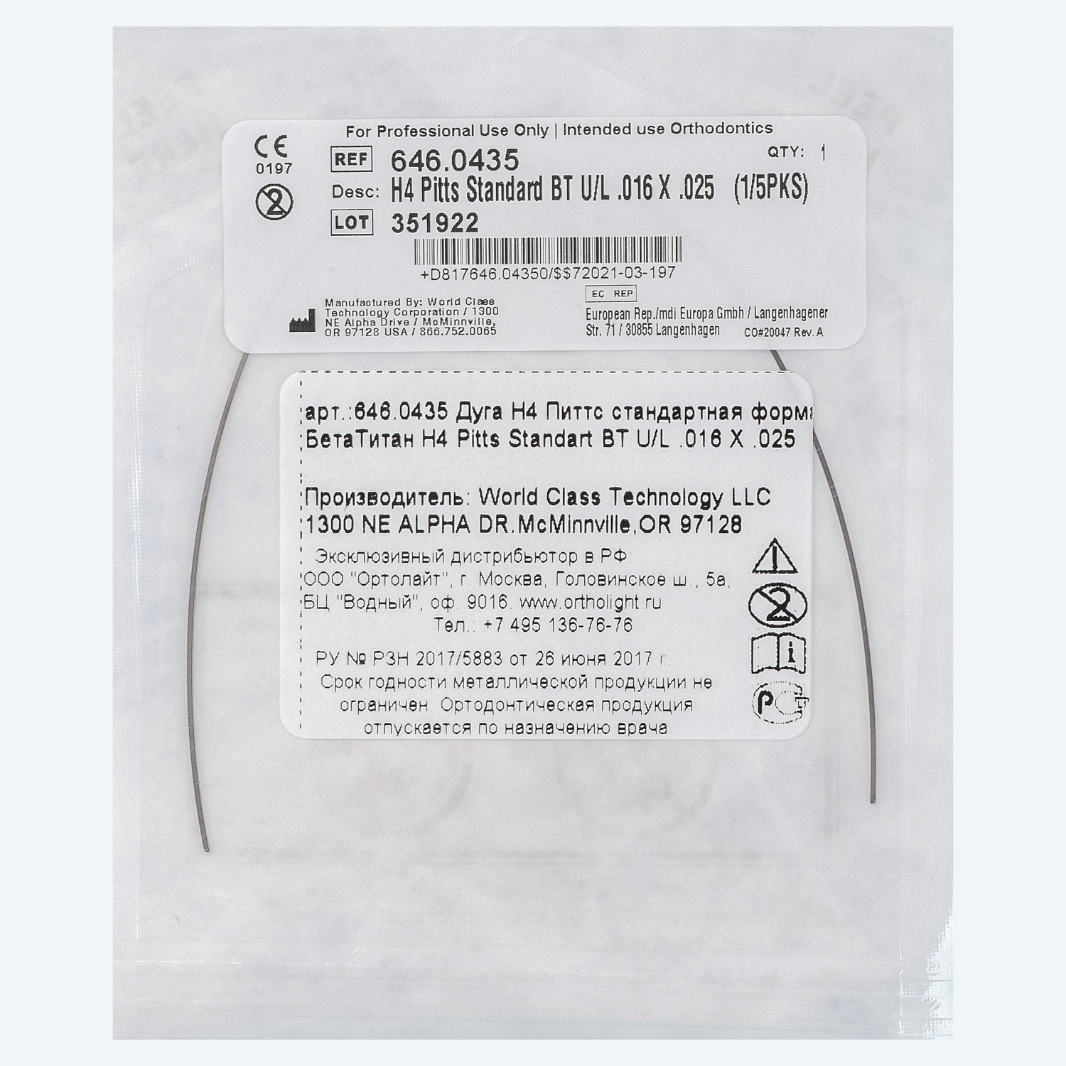 Дуга Бета-Титан H4™ форма Питтса Стандартная U/L .016 X .025