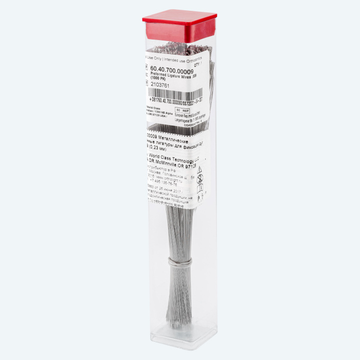 Изготовлены из мягкой стали, имеют закрученный кончик и прекрасно подходят для быстрого лигирования. Длинные лигатуры выпускаются в упаковках по 1000 штук. Короткие лигатуры в упаковках по 500 шт. Лигатуры с покрытием под цвет зуба выпускаются как длинные, так и короткие в упаковках по 100 шт.